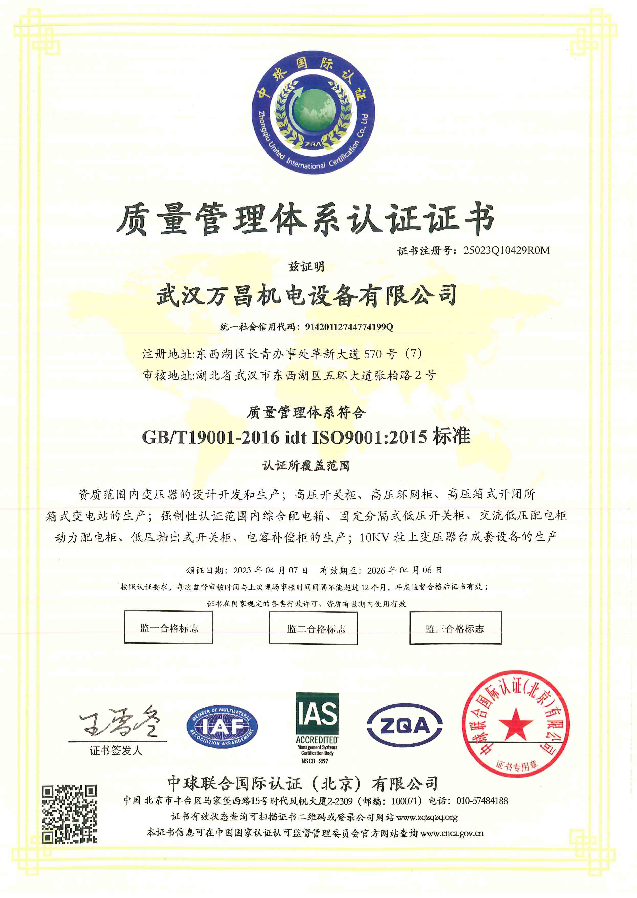 質(zhì)量管理體系認(rèn)證證書